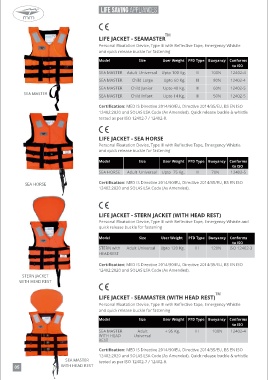 SEA MASTER     tested as per ISO 12402-7 / 12402-8.                                                                                     Certification: CE (European Certification) and conforms to Solas LSA Code 74/83